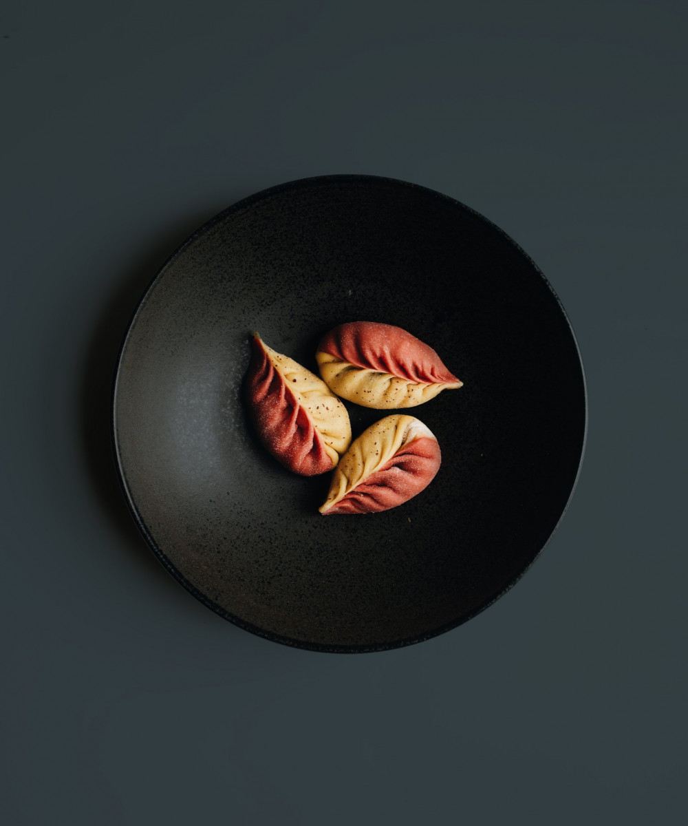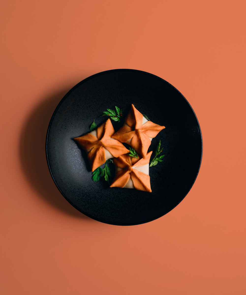 A dumpling that's an homage to Taiwanese and Californian cuisine, this dumpling has sweet roasted carrots and juicy pork and features a creative origami fold with two colors, definitely a lot of effort but worth it!