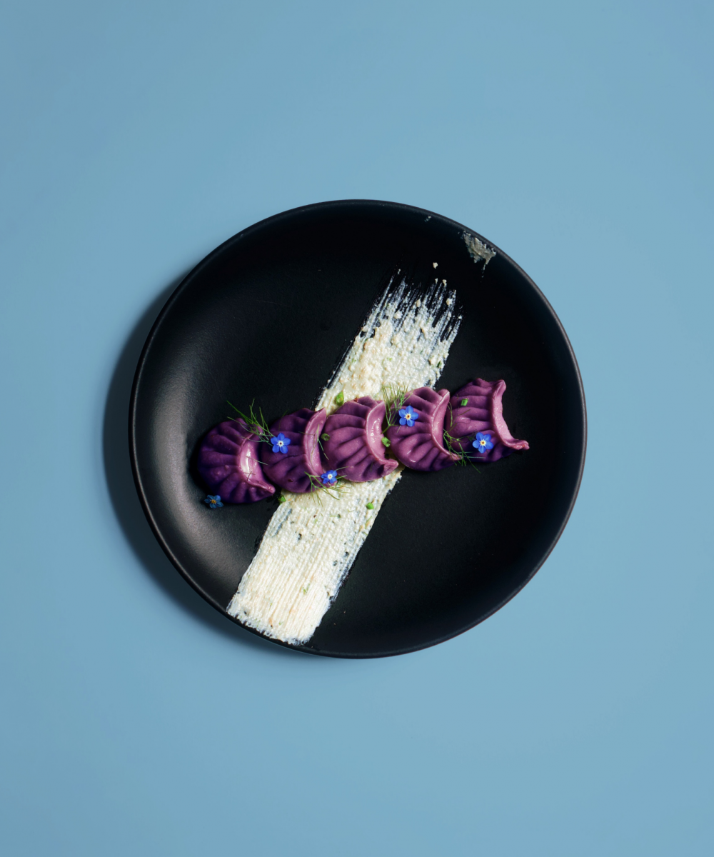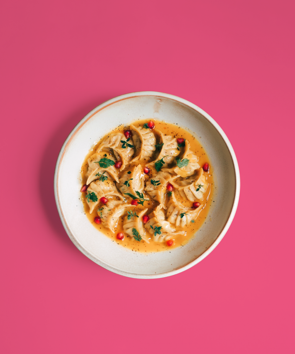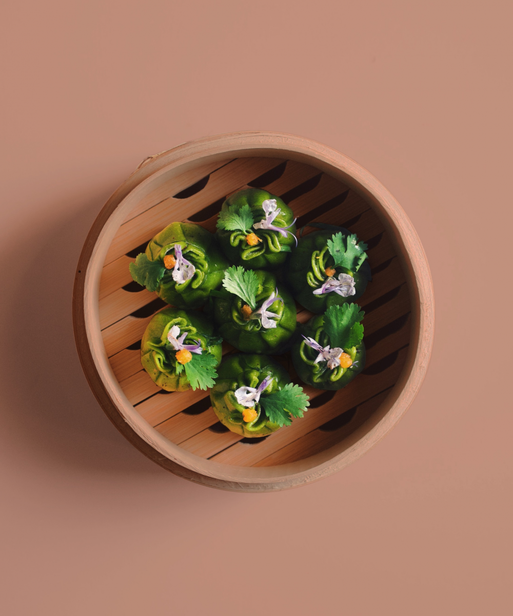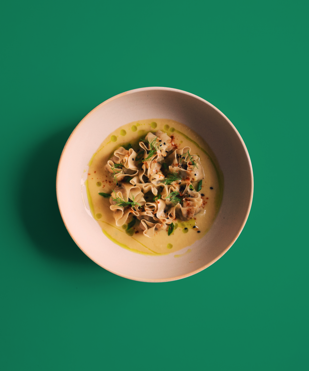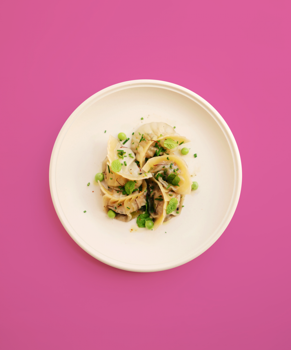 A vegetarian dumpling filled with seasoned tofu that pays homage to ravioli and ricotta (while still being dairy free) in the form of a dumpling.