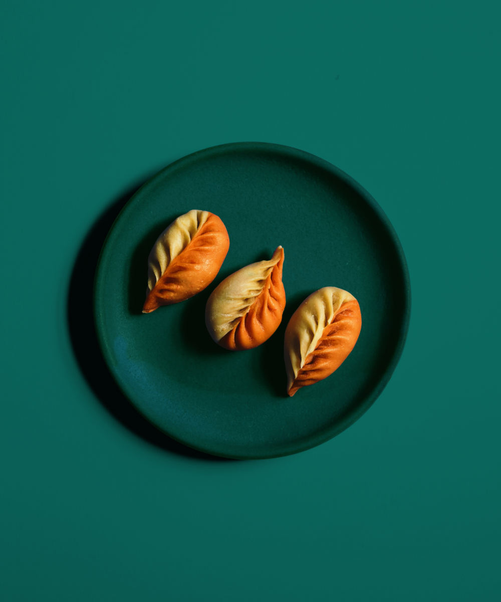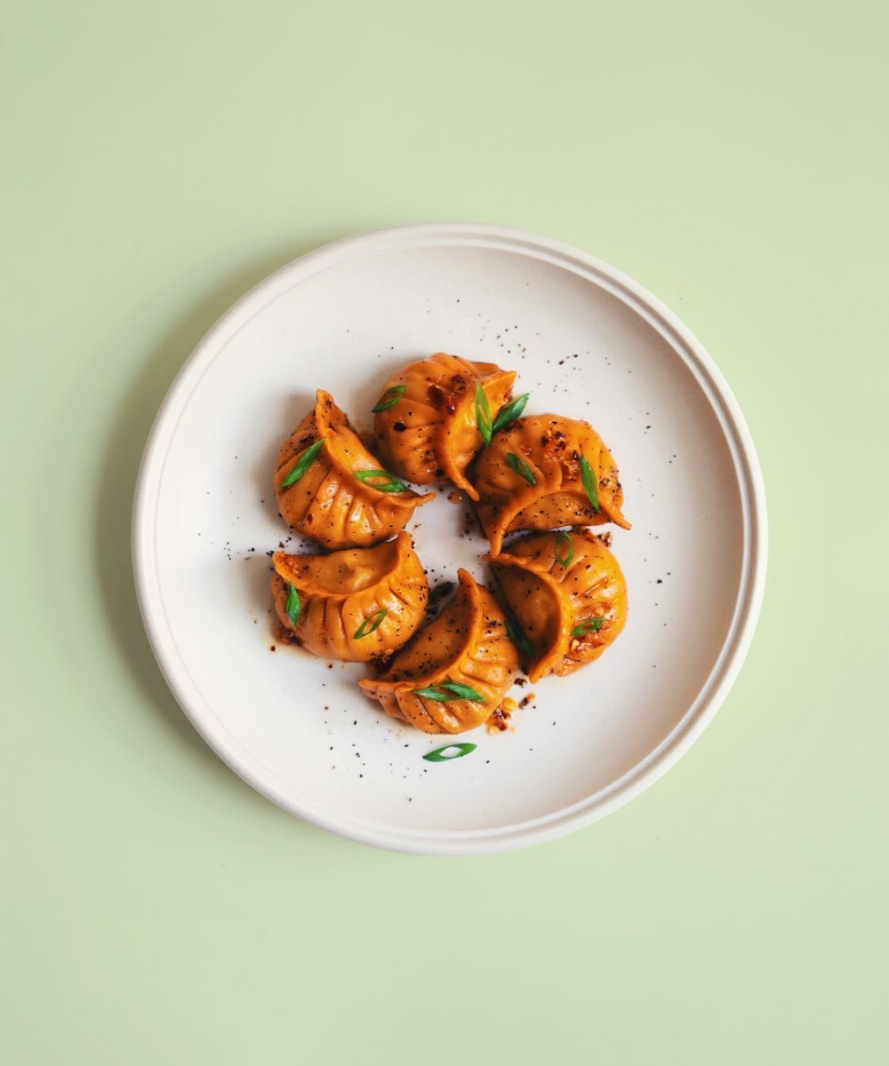 A classic filling with a Little Fat Boy-ified vibrant tomato based dumpling wrapper to pair with chili crunch and coconut aminos.