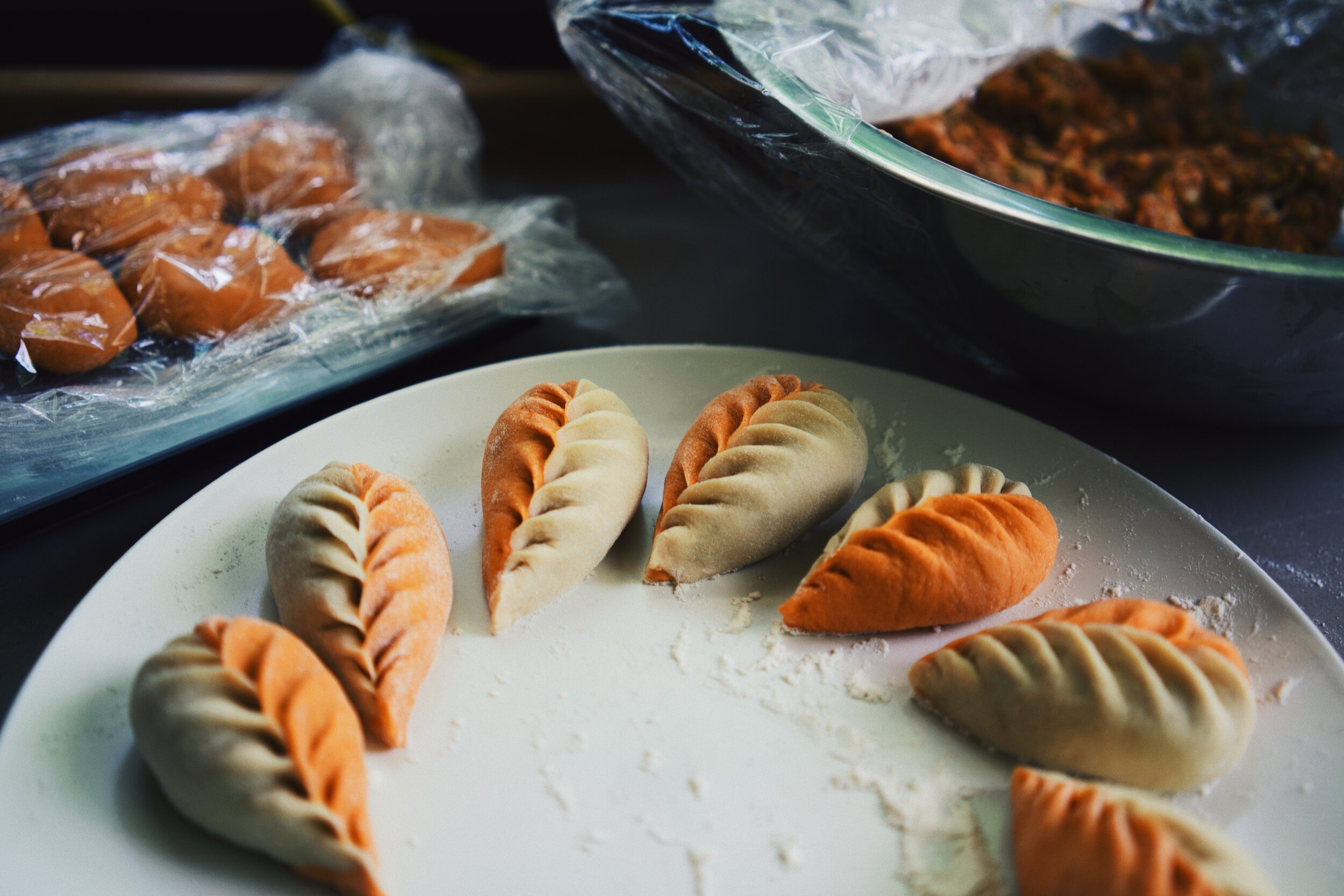 Lightly dust a work surface with flour. When your dough is ready, take out both colors and cut each in half. Keep a half of each color to use, while storing the other half in plastic wrap to keep from drying out. Roll orange and white half into two cylinders, about the size and shape of a very large sausage. Cut each cylinder into 5 equal pieces, they should look like marshmellows. Then, turn each piece cut side up and with the palm of your hand, press down onto it to flatten to make a roughly flattened circle. Dust each side with flour and then with a rolling pin, flatten to create a circular wrapper to desired thickness, about an 1/8 of an inch - not too thin but not too thick. Repeat with the rest of your marshmellow dough pieces until you have a bunch of wrappers. Make sure to flour each wrapper as you roll them out and then cover with plastic wrap so they don't dry out.