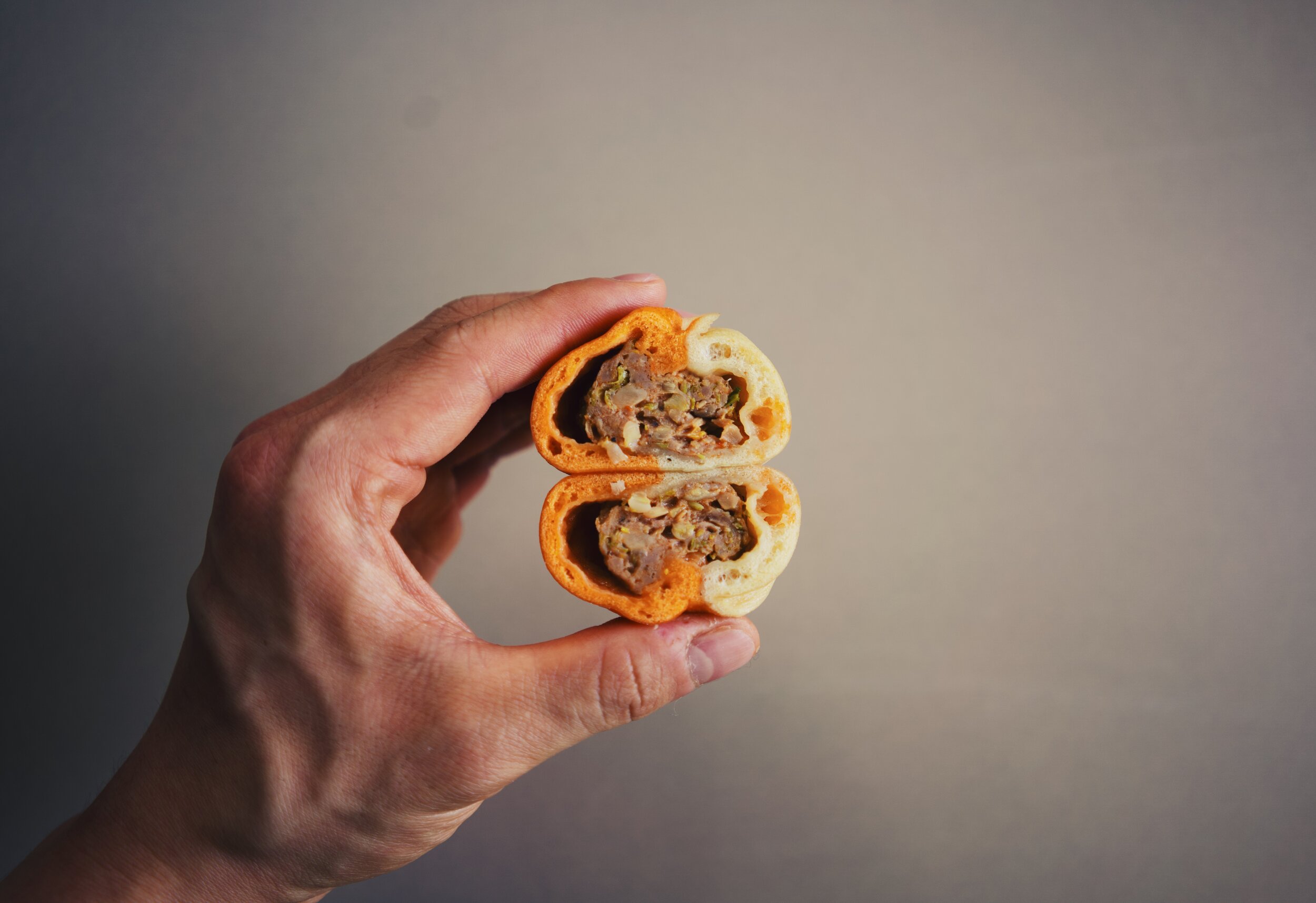 A colorful riff on the flavors of Taiwanese pork pepper buns, this steamed bun is filled with pork that's seasoned with black pepper and red bell pepper paste and paired with napa cabbage and shiitake mushrooms. It's colorful wrapper is made with red bell peppers that are cooked down and used as a paste to dye the flour. A nostalgic dish of grandma's kitchen and Taipei night markets all in a colorful, flavorful package.
