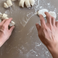 To fill, place a ping pong sized amount of pork filling into the wrapper (it's okay if it seems like a lot). Create a taco shape with the wrapper and push one of the ends a 1/2 inch into the meat to make a “w”. Squeeze the to folds together and push into the meat again. This time, take the right half of the “w” and pinch, push into the filling, then take the left half of the “w” and pinch, squeeze into the filling again. Repeat this process (the excess meat will squeeze itself out) until you've enclosed the meat. Pinch the tail end of the braid and shape the dumpling to resemble a tear drop.