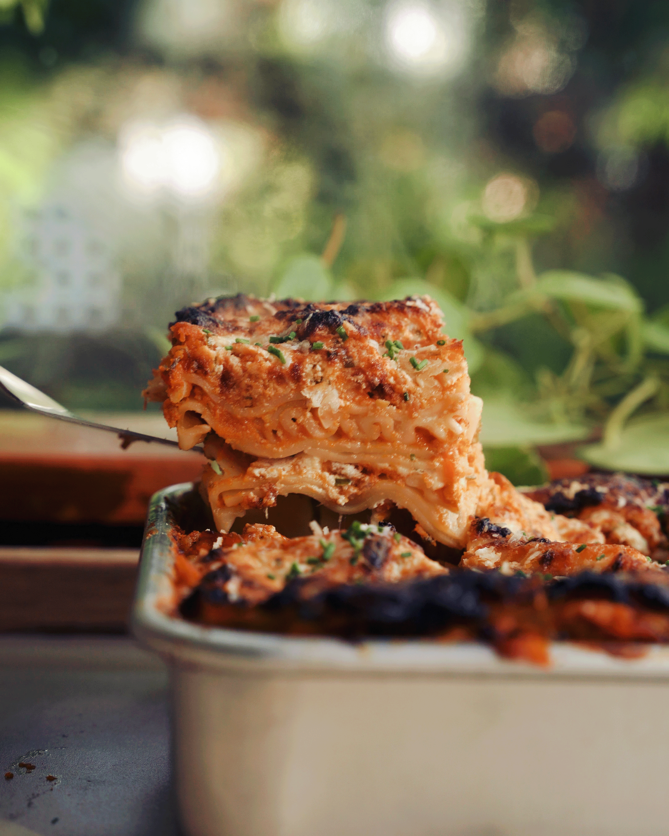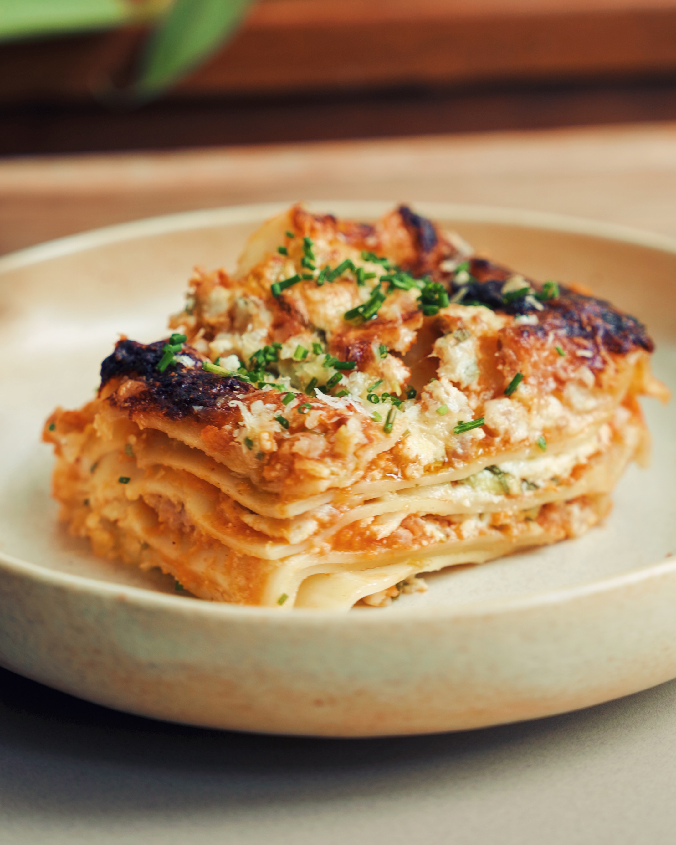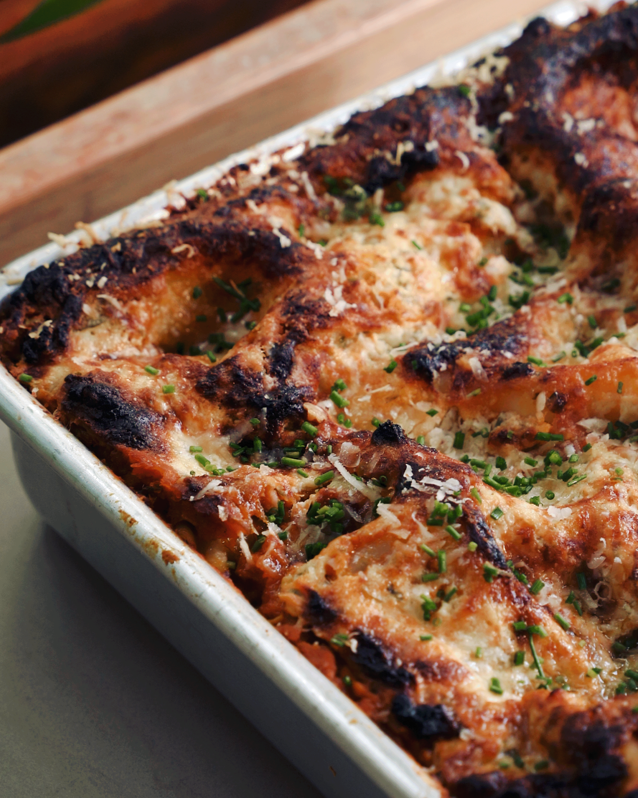 Cook for 45 minutes until the top and edges are crisped and melted with some brown spots. Rest for 30 minutes so the lasagna can set. Cut into squares and serve with some extra scallions or chives on top!