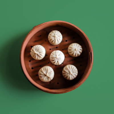 A steamed pork bun with a fluffy dough and a savory filling made with ground pork, roasted carrots, ginger, and scallions - a slight riff on a grandma classic.
