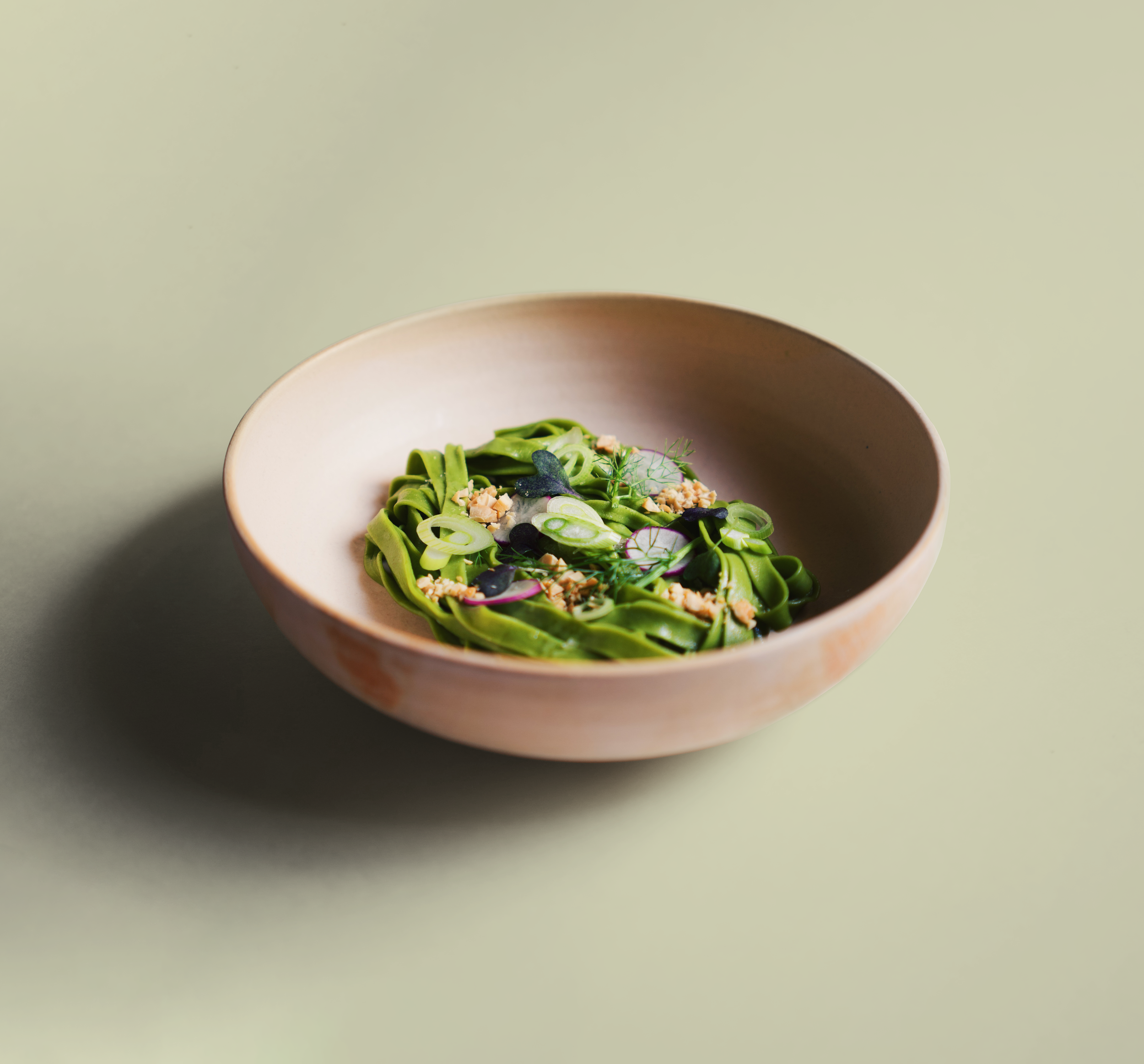 This noodle bowl looks like a salad, but don't get it twisted it's definitely still carbs and will give you a doughy body (worth it imo). Green noodles, made with spinach, are something my grandma would always make me by hand in our kitchen. She always paired it with the most delicious sauces that were always so flavorful. This particular sauce is a miso mirin sauce mixed with fresh garlic and ginger. Hot oil is then poured over the final dish to really bring out the aromatics.