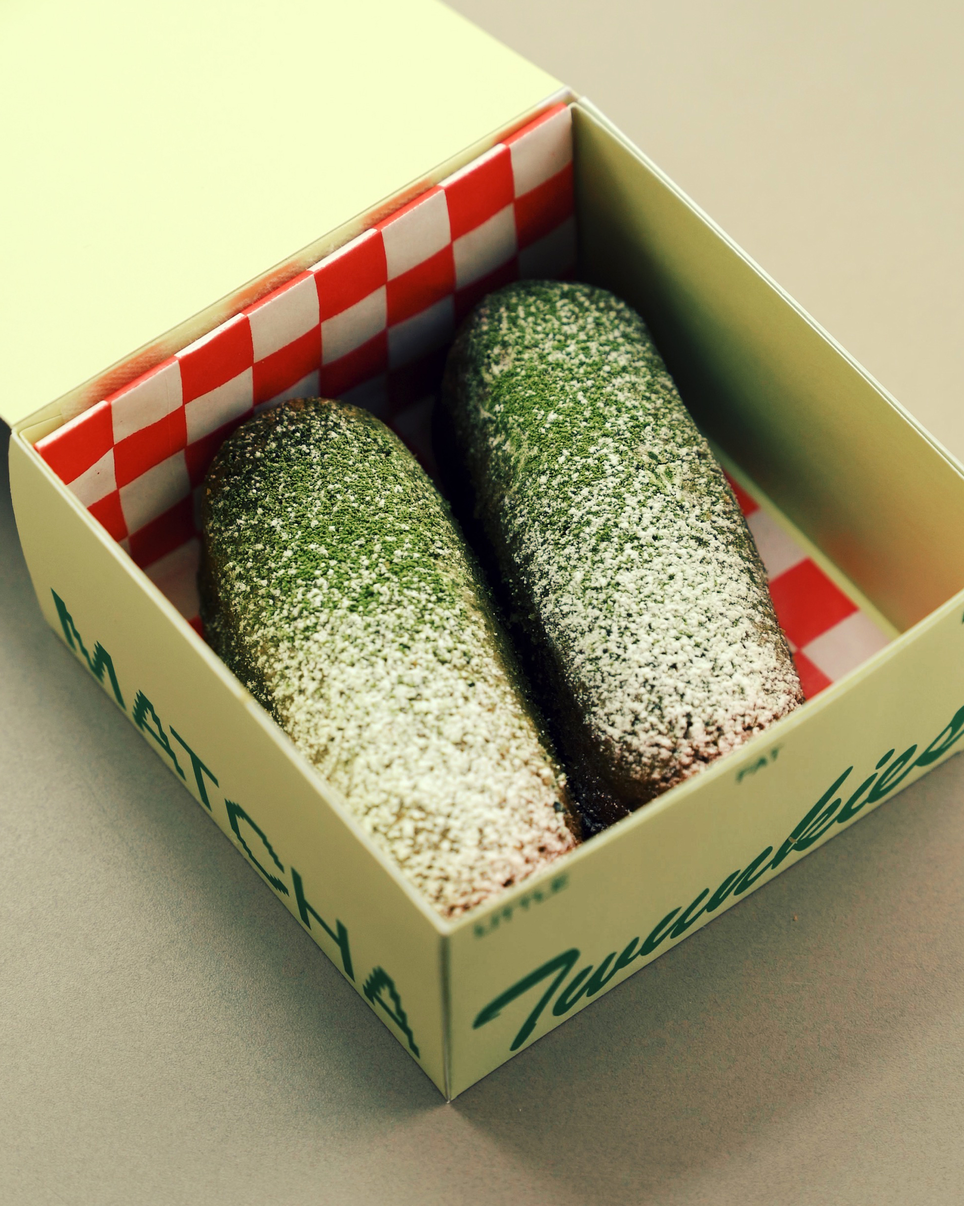 Once the mochi cake Twunkie has cooled, remove from molds and with a knife, poke 3 holes on the flat bottom side. With the piping bag or a Ziploc bag with the corner cut off, squeeze cream into the each of the holes to fill the Twunkie. With a fine mesh sieve, sift a sprinkling of matcha powder and powder sugar on the tops of the Twunkies and serve fresh.