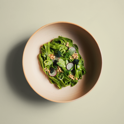 A spring noodle dish made with spinach noodles and coated with a savory sweet miso mirin sauce and topped with scallions, ginger, and garlic.
