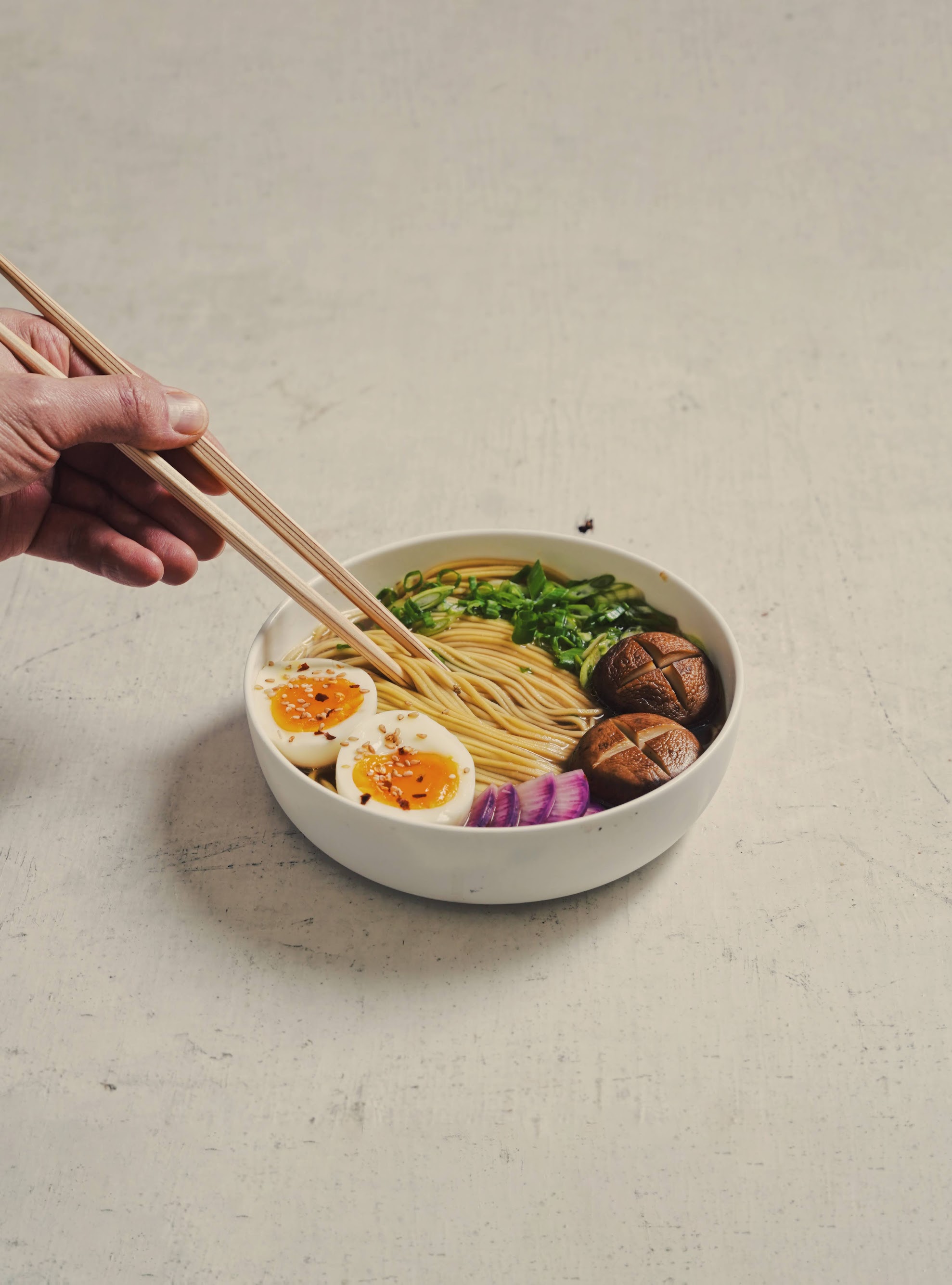When almost ready to serve, prepare your toppings and noodles. For soft boiled eggs, bring a pot of water to boil, then add in eggs and cook covered for 6 minutes and 30 seconds. Once cooked, carefully remove eggs and peel when it isn't scorching hot to the touch. Cut into halves when serving. For noodles, cook in a pot of boiling water according to package instructions. To serve, ladle soup in individual bowls. Add cooked noodles along with soft boiled eggs. Top with your favorite herbs or acid-y crunchy things. I personally love some chopped scallions and a sliced pickled thing like daikon or turnip.