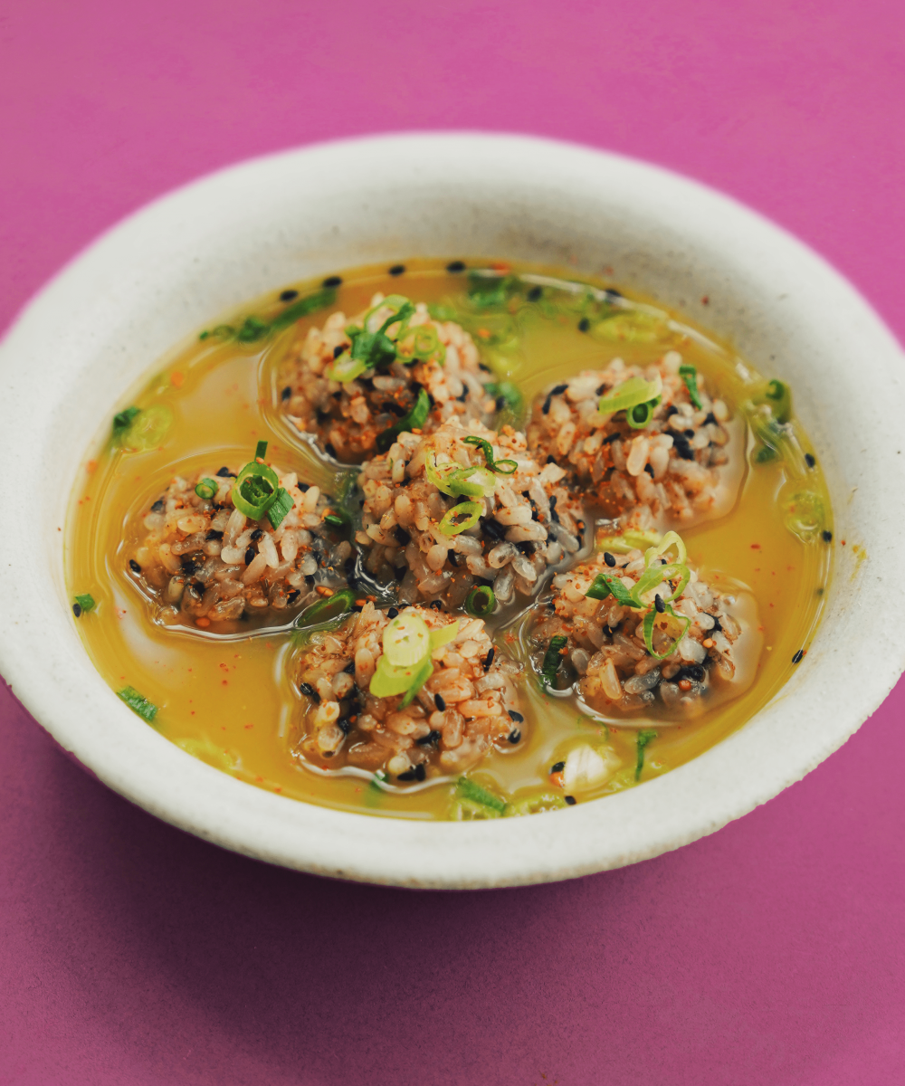Pork and honeynut squash meatballs are wrapped in sticky rice, sesame seeds, and furikake. Add them to broth for the perfect cold weather dish.