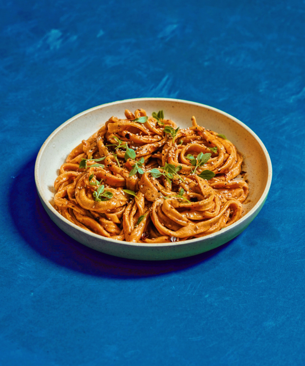A creamy, spice pasta dish where pecorino romano meets chili crisp in this very non-traditional homage to cacio e pepe that comes together in a pinch.