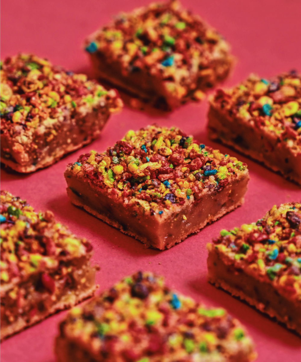 Hawaiian butter mochi is combined with childhood Fruity Pebbles to create a chewy explosion of color, texture, and flavor that will make your inner child very happy.