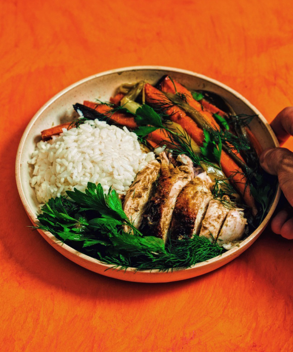 A whole, spatchcocked chicken that's doused with an herby oil made of scallions and dill, then roasted on top of carrots and whole scallions. A perfect one-pan meal to eat with white rice.