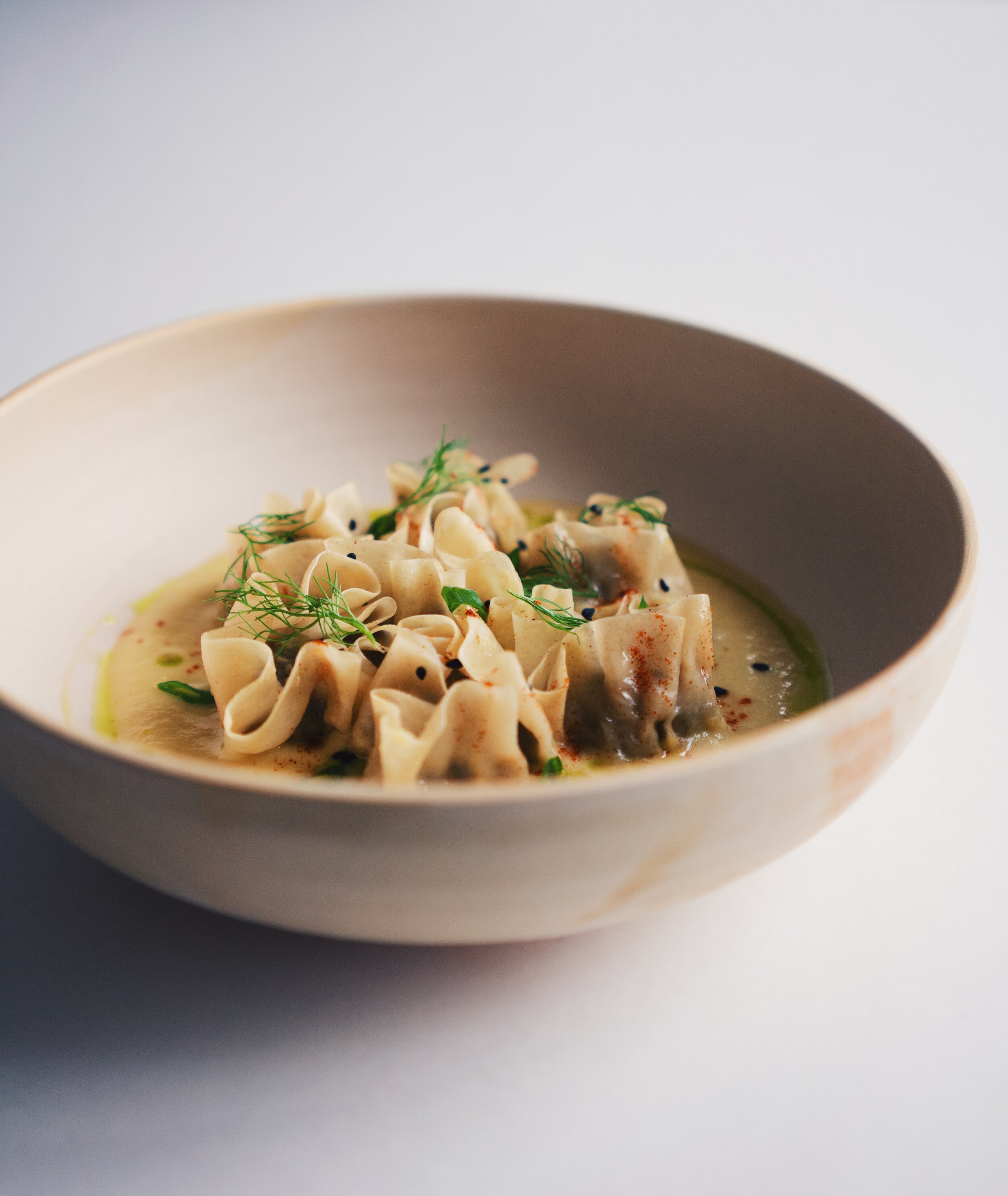 Pour broth into a shallow bowl. Place wontons in the middle and garnish with fennel fronds, sliced green onions, black sesame, and a little sprinkle of paprika. Drizzle green scallion oil and serve.