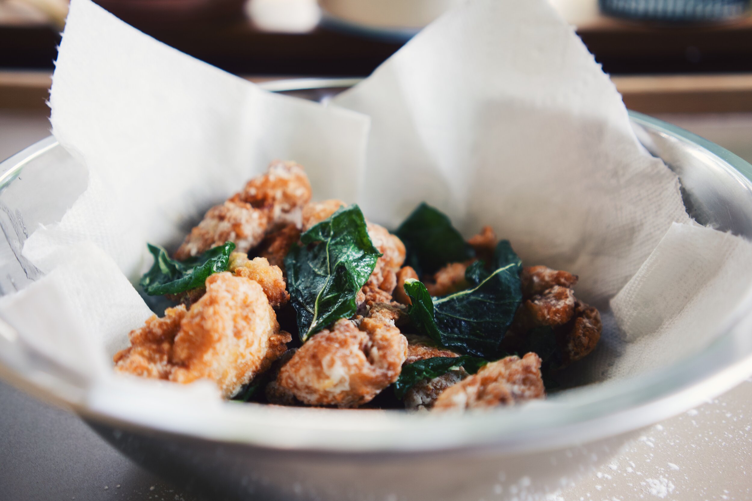 With the heat at low-medium, fry chicken in batches until lightly golden brown, about 2-3 minutes. Set aside on a tray with paper towels. Turn the heat up to high to get the oil to a hot temperature (but not smoking). For the final fry, place your chicken and basil back in the pot again to flash fry for about 30 seconds to minute until brown. Transfer to bowl with paper towels, Sprinkle salt and pepper. Serve fresh.