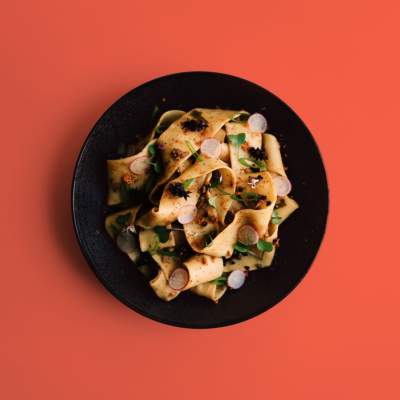 A play off one of my favorite Taiwanese noodle dishes, zha jiang mian 炸酱面. The secret sauce here is a mix of sweet and savory black bean sauce and hoisin simmered with juicy pork.