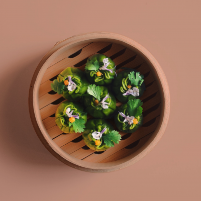 Serving you a vegetable shumai filled with seasoned rutabaga, a sweet turnip like root vegetable along with scallions, ginger, and garlic in the tiniest of packages.