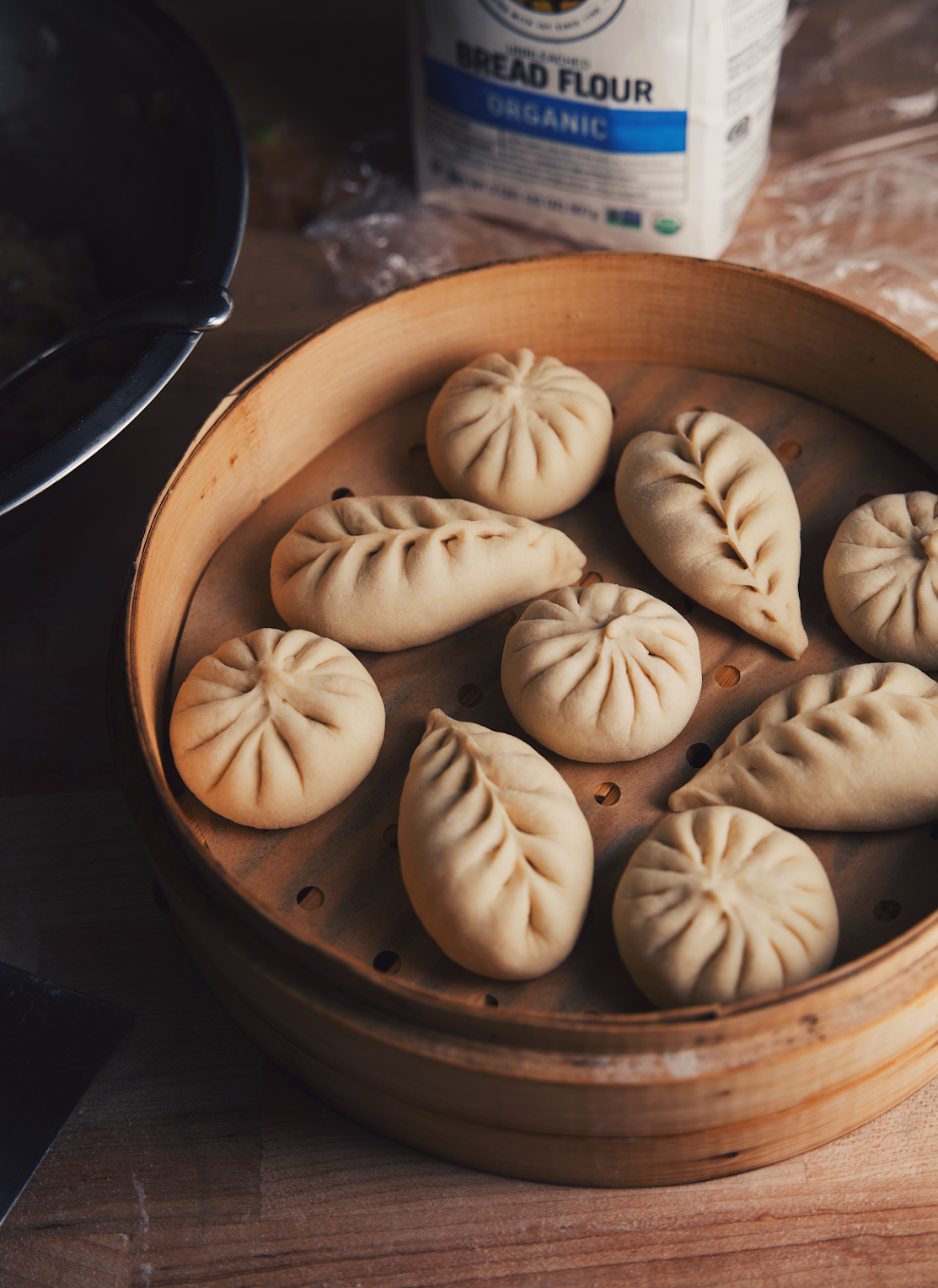 A steamed bao with marinated soy chicken that really highlights the dough. The chicken filling itself is marinated in soy and apple, which gives it a sweet and savory flavor complimented by a collection of greatest hits scallion, ginger, and garlic. For the dough, I used King Arthur Baking Bread Flour, which I love recommending for anyone trying bao for the first time because it’s so flexible and hard to mess up. This flour consistently makes dough thats easy to shape and fold while creating seriously fluffy steamed baos that you could honestly sleep on if you made pillow sized. Thanks King Arthur Baking for sponsoring this bao!