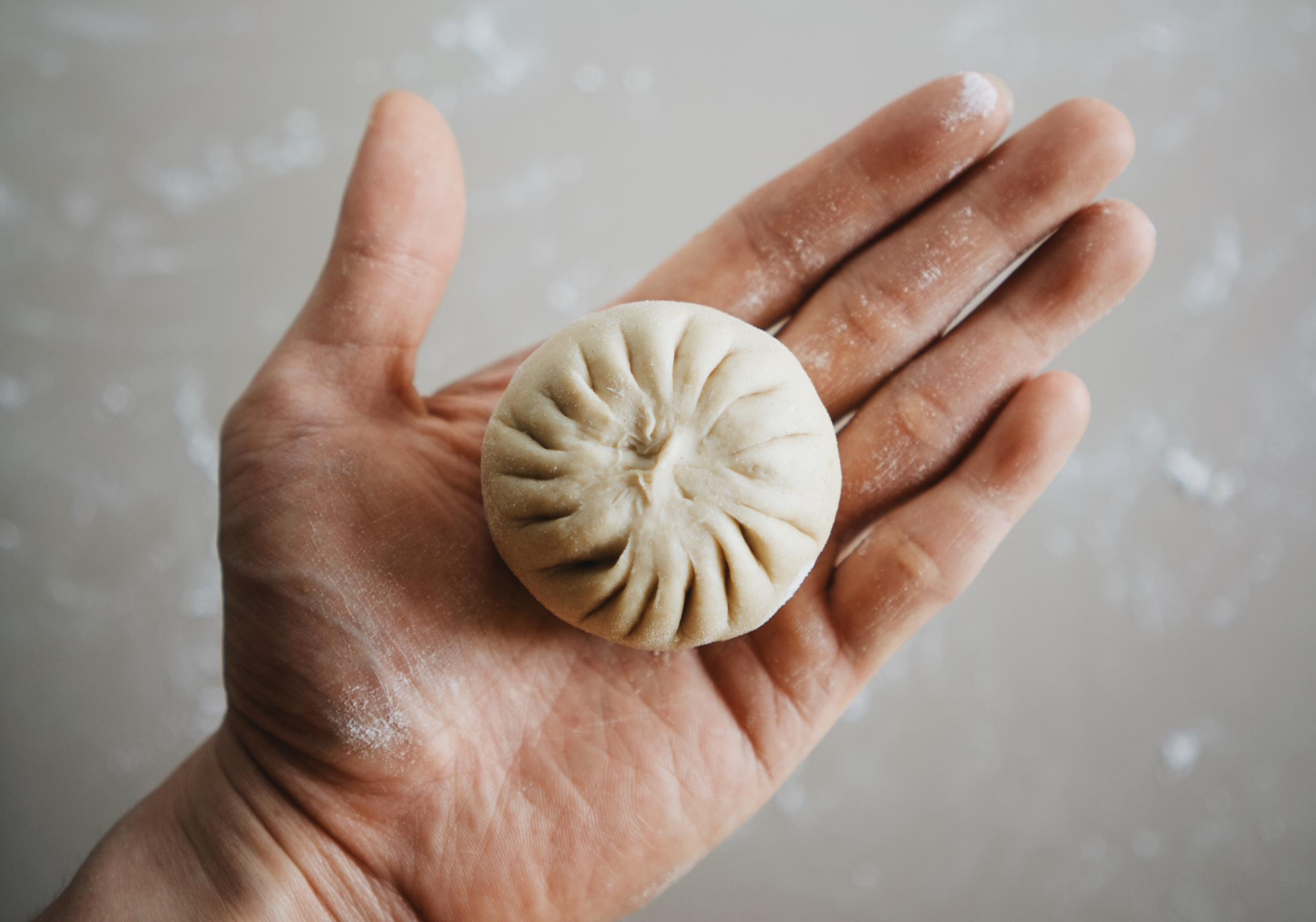 You can fold the baos however you'd like and have fun with it! For a classic circular fold, place a spoonful of meat in the center of your flattened dough. Then pleat around the meat with small fold, pushing the meat down as the wrapper starts to close in around it. Seal the bao and set aside.