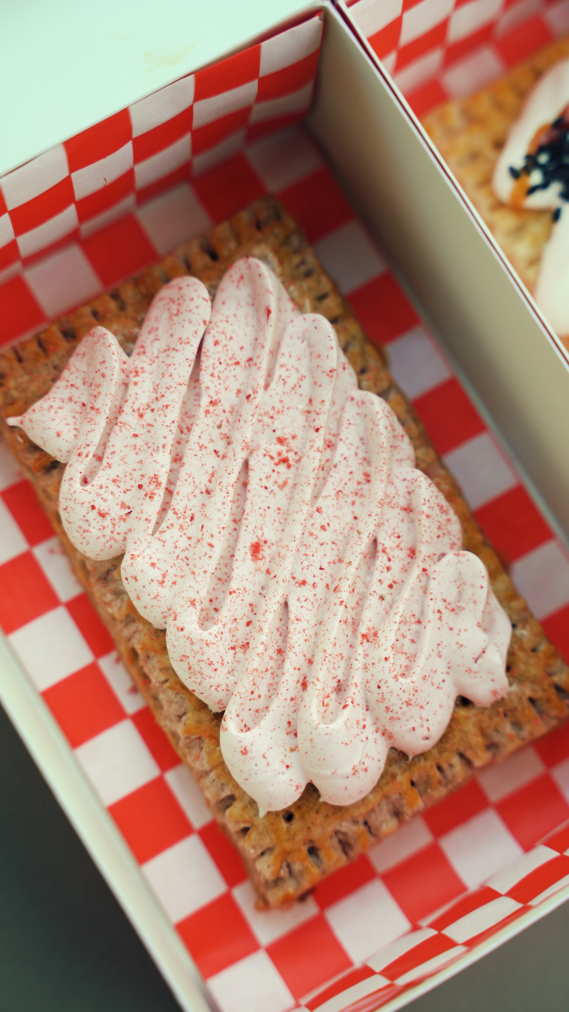 In a small mixing bowl, add egg white and beat slowly with a hand mixer for a minute until frothy. Add powdered sugar a little at a time and beat on medium high speed. As you add the powdered sugar in, it should go from from tooth paste texture to a light, fluffy icing with peaks. Once you see peaks, add in ground freeze dried strawberry, kosher salt, and vanilla and mix again until combined and the icing has stiff peaks. Scoop icing into a pastry bag or a Ziploc bag with the corner snipped and set aside.