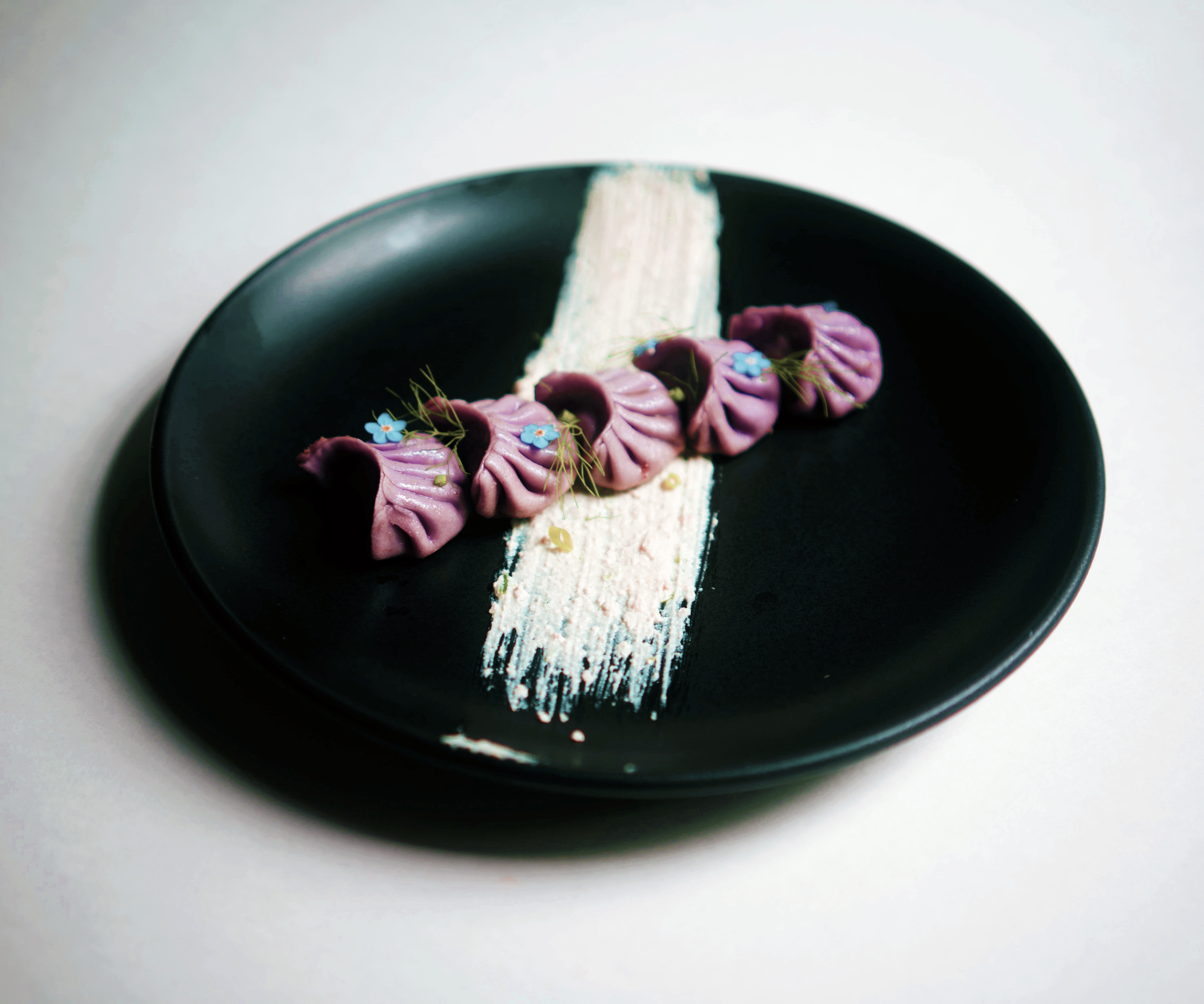 A vegetable forward dumpling featuring bok choy, shiitake mushrooms, and roasted golden beets that's then paired with ground pork.