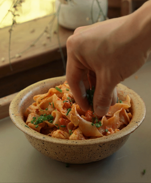 Return the eggs to the pan, stirring to fold them into the sauce. Add cooked noodles into the pan and mix everything together. Serve the tomato egg noodles topped with some chopped scallions and basil.